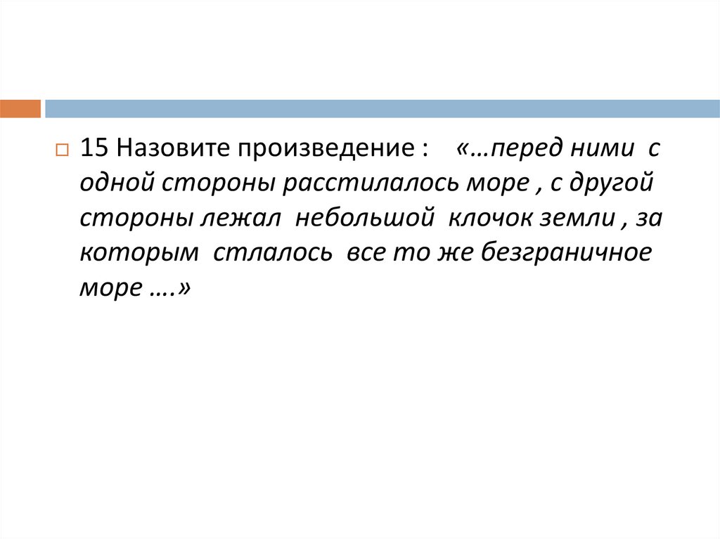 15 Назовите произведение : «…перед ними содной стороны расстилалось море , с другой