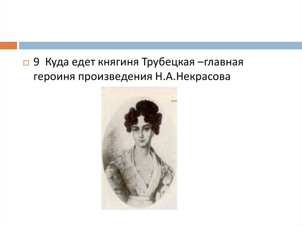 9 Куда едет княгиня Трубецкая –главнаягероиня произведения Н.А.Некрасова