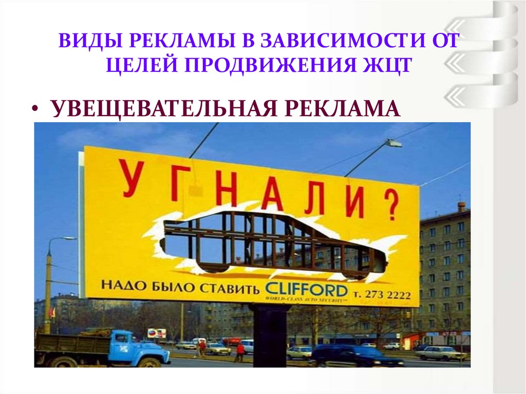 ВИДЫ РЕКЛАМЫ В ЗАВИСИМОСТИ ОТЦЕЛЕЙ ПРОДВИЖЕНИЯ ЖЦТ