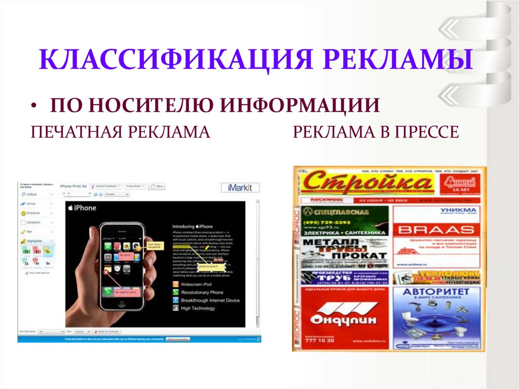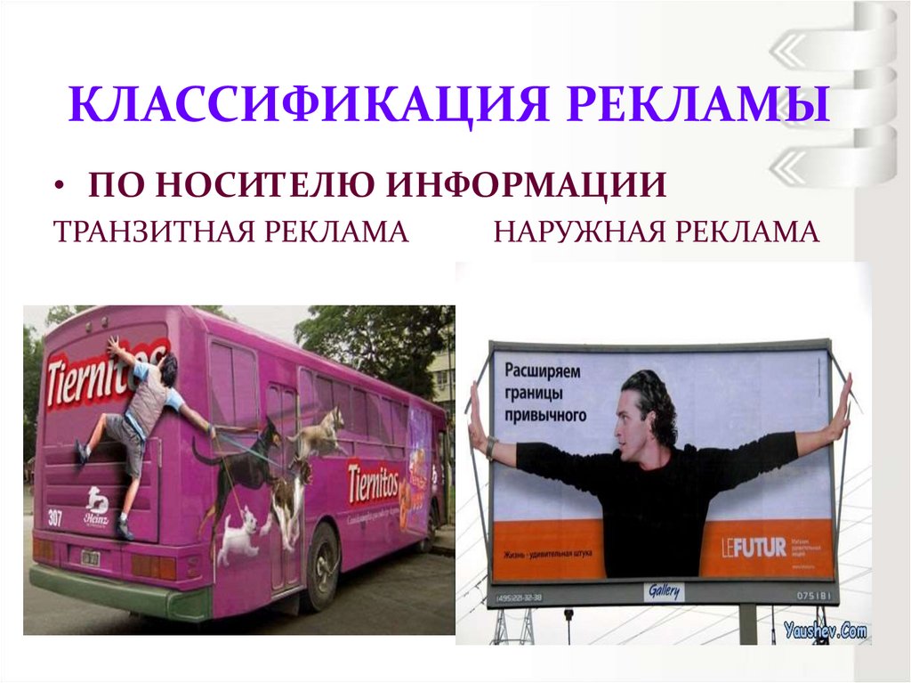 КЛАССИФИКАЦИЯ РЕКЛАМЫ• ПО НОСИТЕЛЮ ИНФОРМАЦИИ