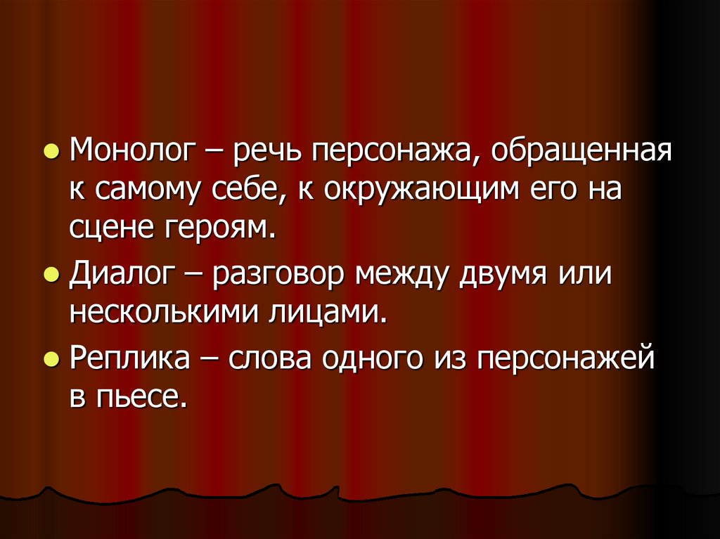 Монолог – речь персонажа, обращеннаяк самому себе, к окружающим его на