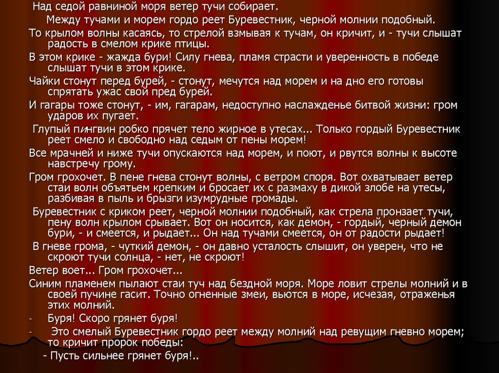 Над седой равниной моря ветер тучи собирает.Между тучами и морем гордо реет Буревестник, черной молнии подобный.