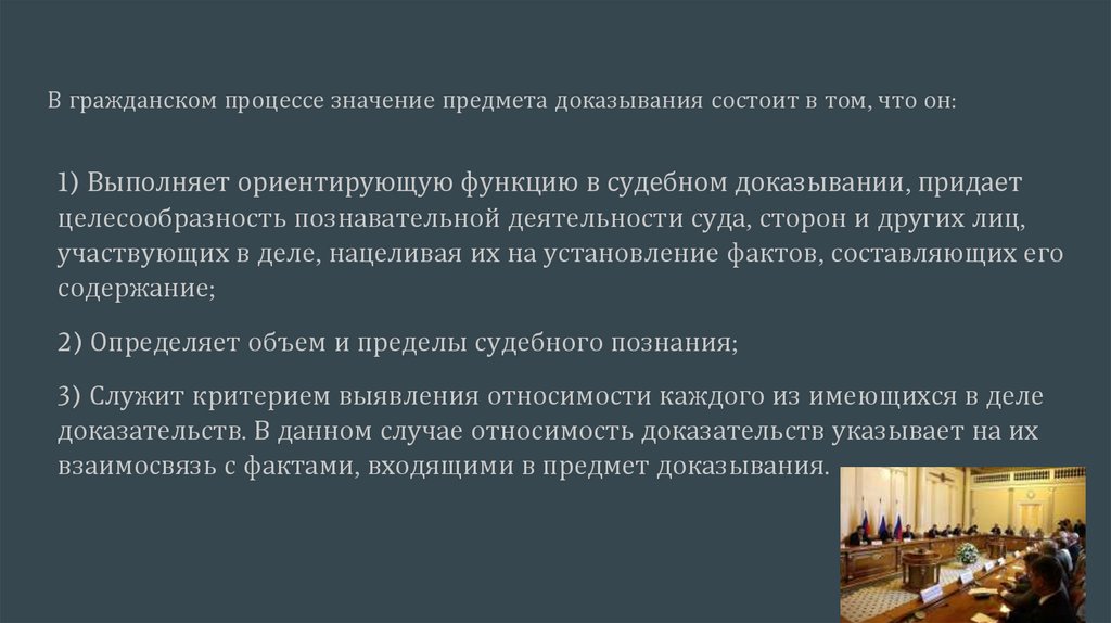 В гражданском процессе значение предмета доказывания состоит в том, что он:1) Выполняет ориентирующую функцию в судебном доказывании, придает