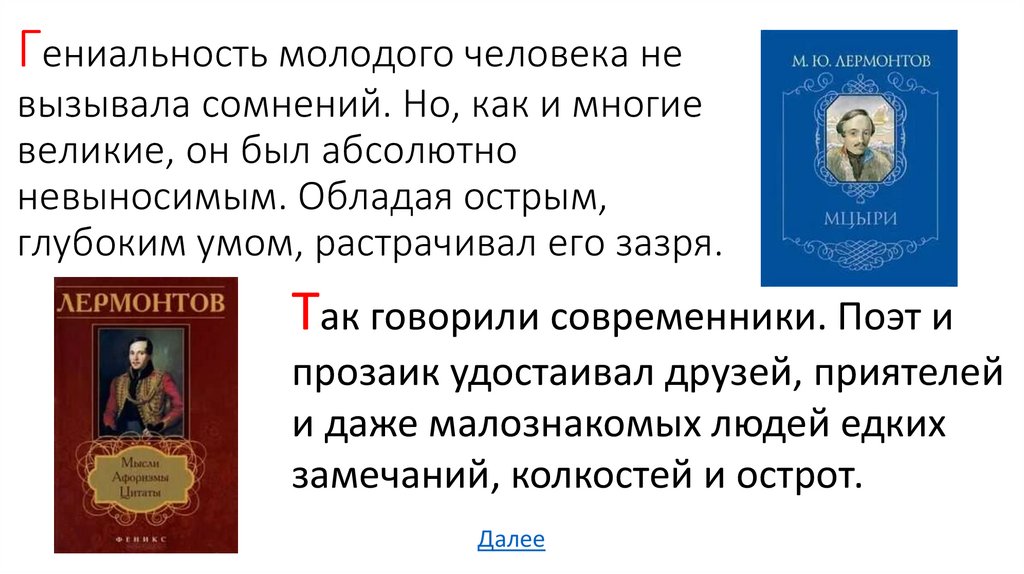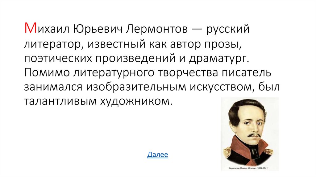 Михаил Юрьевич Лермонтов — русскийлитератор, известный как автор прозы,