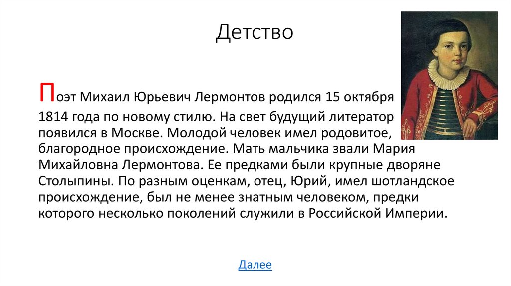 ДетствоПоэт Михаил Юрьевич Лермонтов родился 15 октября