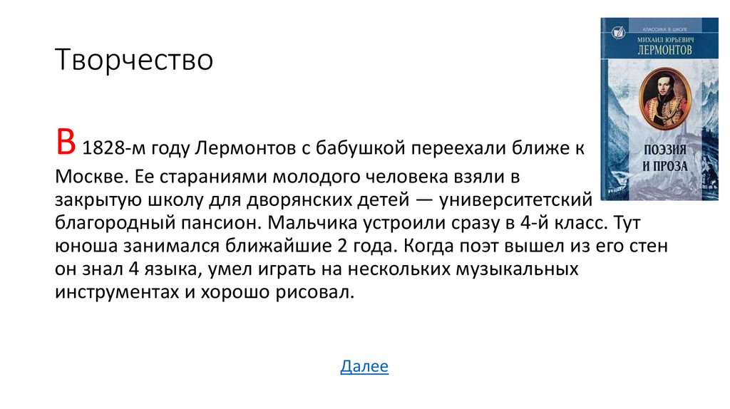ТворчествоВ 1828-м году Лермонтов с бабушкой переехали ближе к