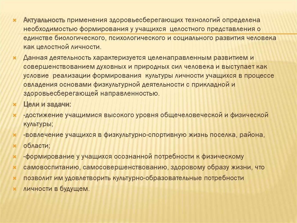 Актуальность применения здоровьесберегающих технологий определенанеобходимостью формирования у учащихся целостного представления о
