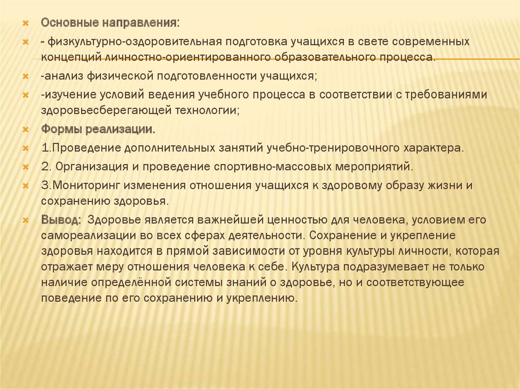 Основные направления:- физкультурно-оздоровительная подготовка учащихся в свете современных