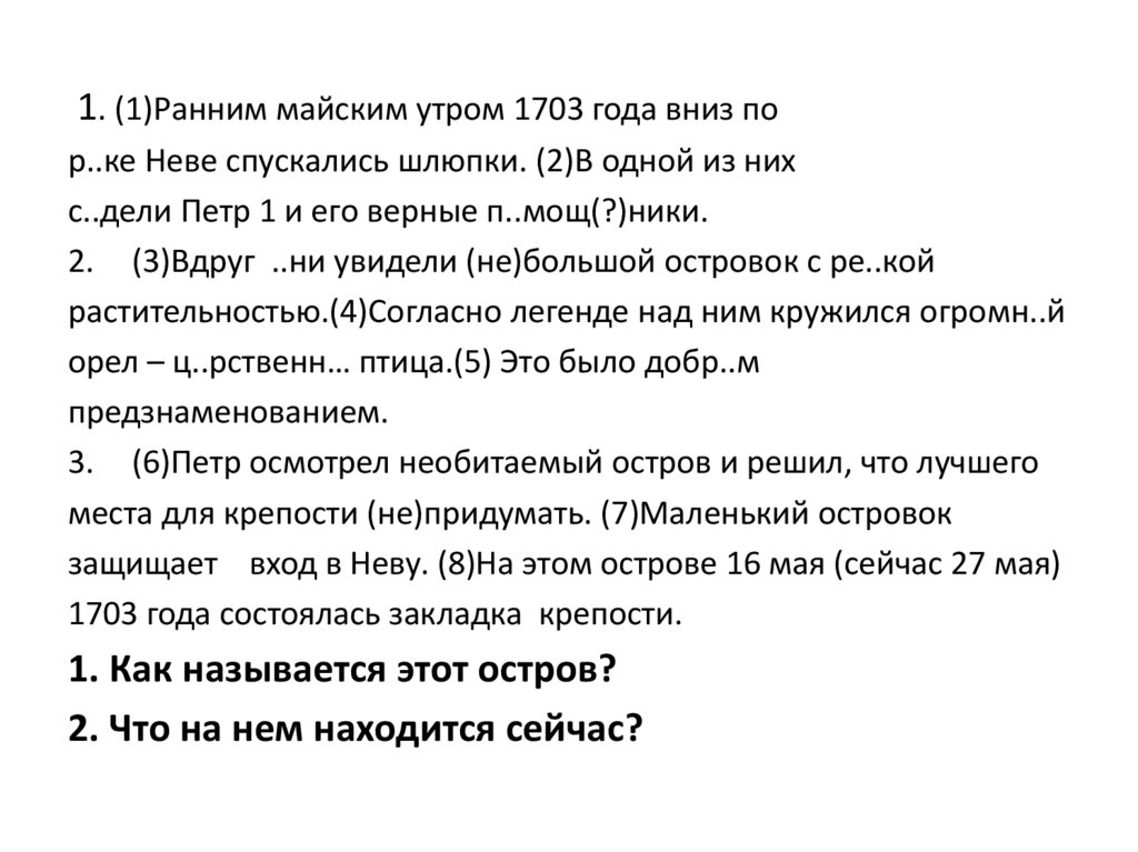 1. (1)Ранним майским утром 1703 года вниз пор..ке Неве спускались шлюпки. (2)В одной из них