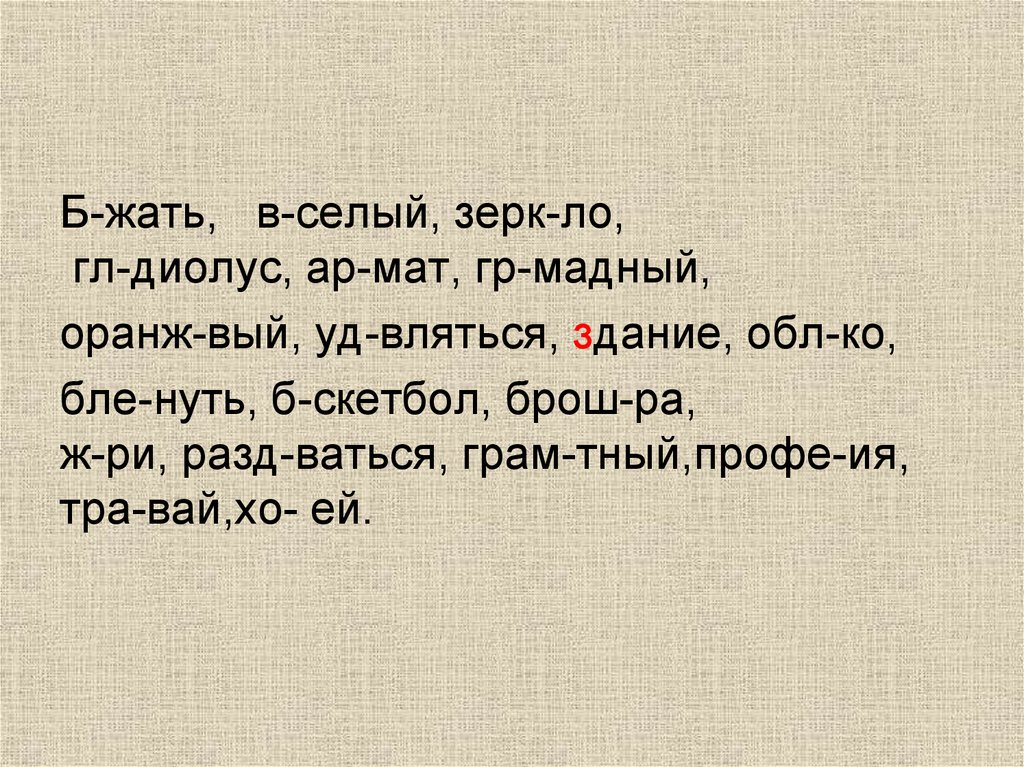 Б-жать, в-селый, зерк-ло,гл-диолус, ар-мат, гр-мадный,