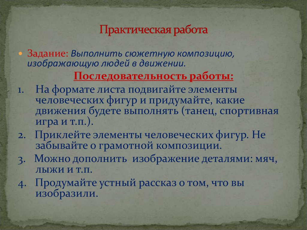 Задание: Выполнить сюжетную композицию,изображающую людей в движении.