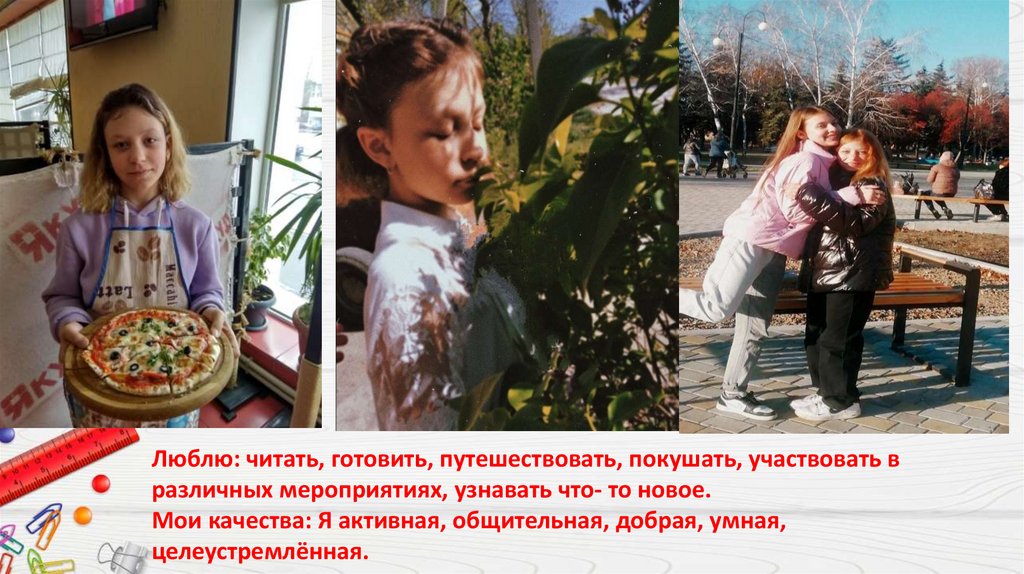 Люблю: читать, готовить, путешествовать, покушать, участвовать вразличных мероприятиях, узнавать что- то новое.