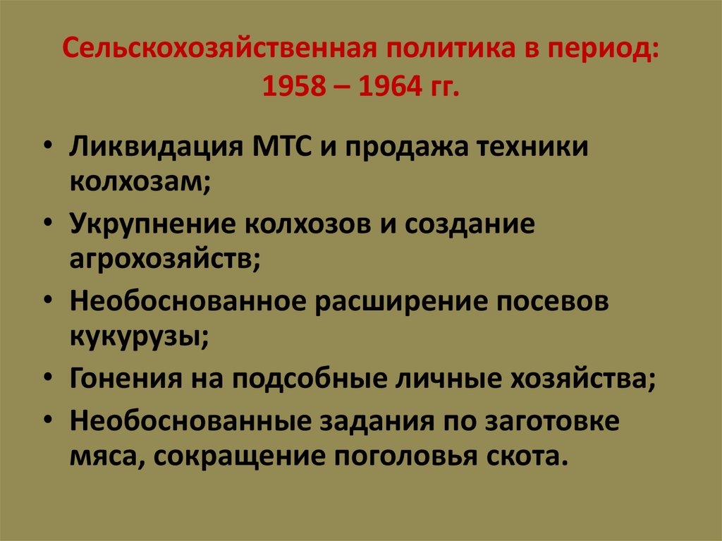 Сельскохозяйственная политика в период:1958 – 1964 гг.
