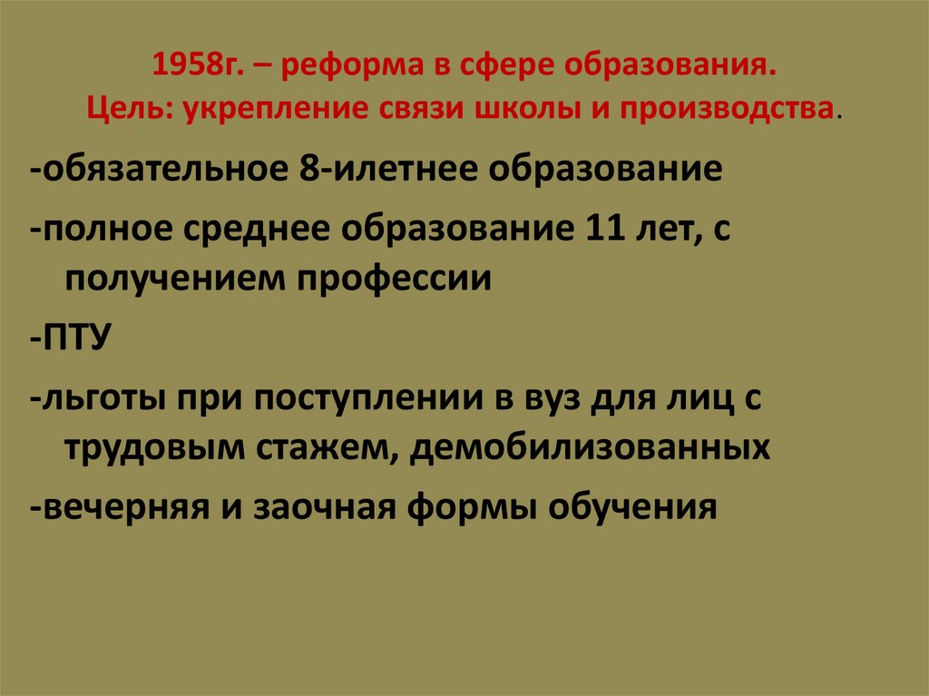 1958г. – реформа в сфере образования.Цель: укрепление связи школы и производства.