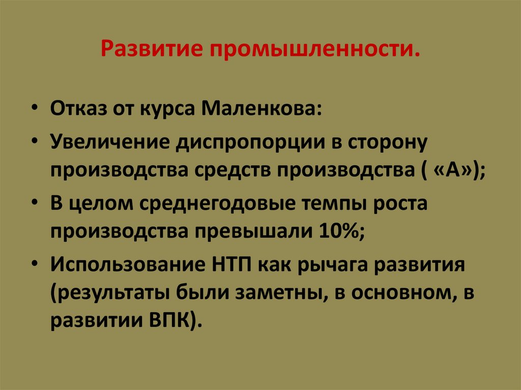 Развитие промышленности.• Отказ от курса Маленкова: