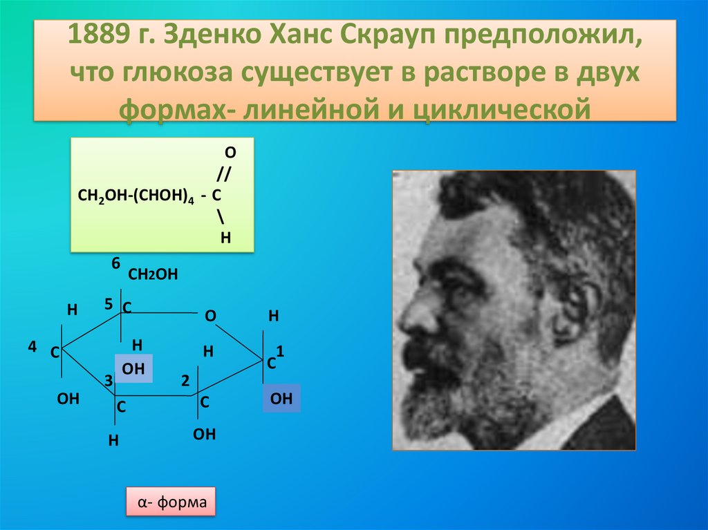 1889 г. Зденко Ханс Скрауп предположил,что глюкоза существует в растворе в двух