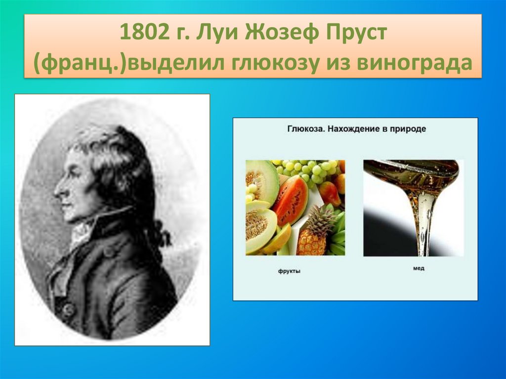 1802 г. Луи Жозеф Пруст(франц.)выделил глюкозу из винограда