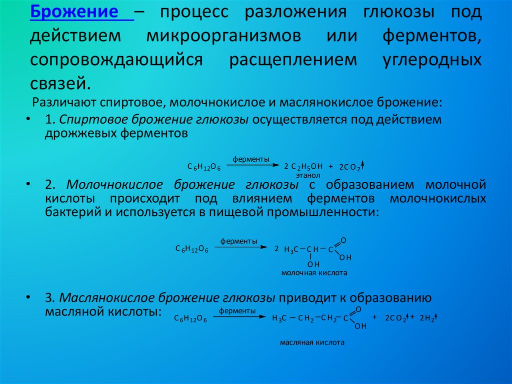 Брожение – процесс разложения глюкозы поддействием микроорганизмов или ферментов,