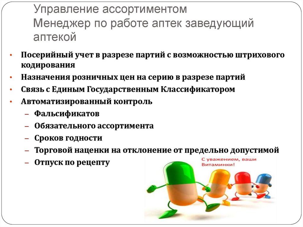 Управление ассортиментомМенеджер по работе аптек заведующий