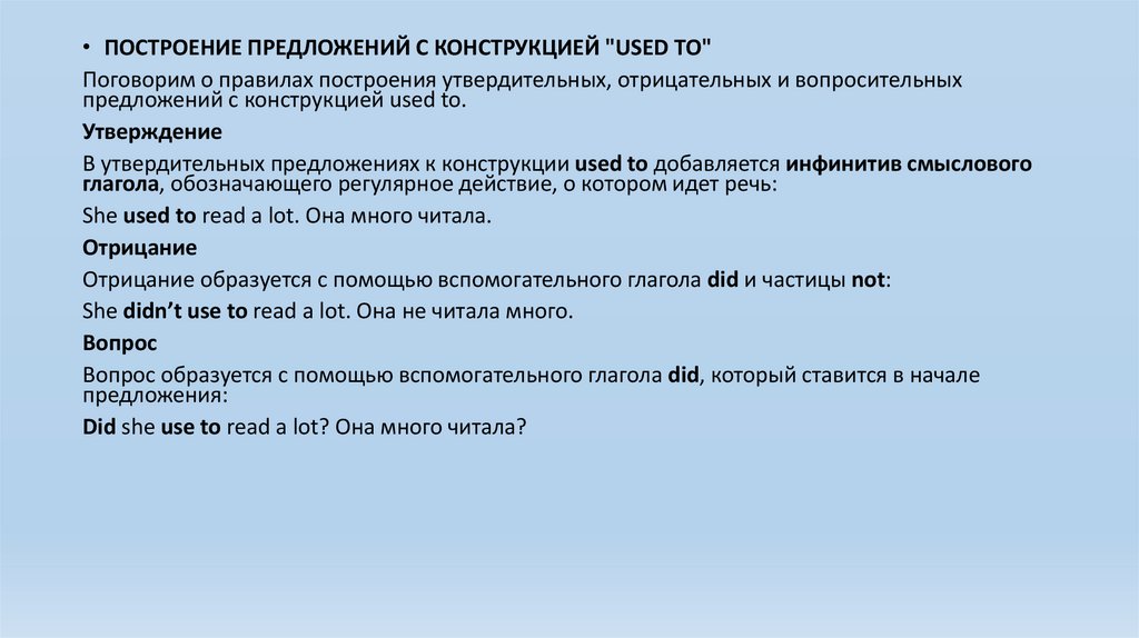 • ПОСТРОЕНИЕ ПРЕДЛОЖЕНИЙ С КОНСТРУКЦИЕЙ "USED TO"Поговорим о правилах построения утвердительных, отрицательных и вопросительных