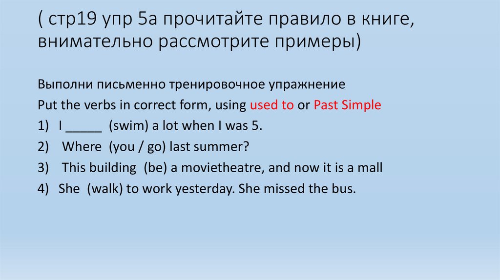 ( стр19 упр 5а прочитайте правило в книге,внимательно рассмотрите примеры)
