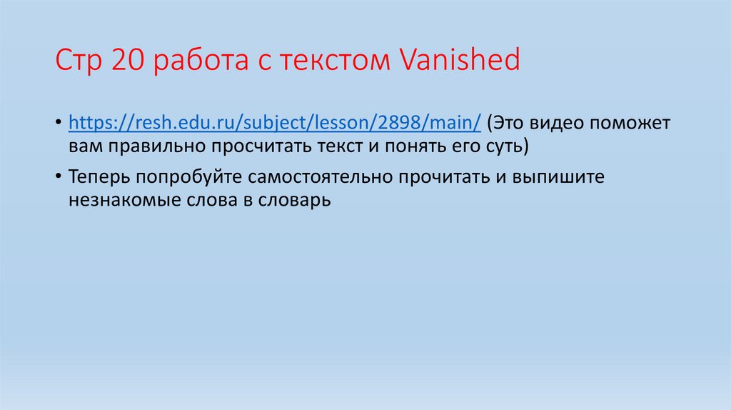 Стр 20 работа с текстом Vanished• https://resh.edu.ru/subject/lesson/2898/main/ (Это видео поможет