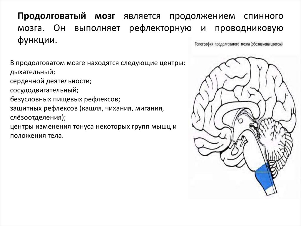 Продолговатый мозг является продолжением спинногомозга. Он выполняет рефлекторную и проводниковую