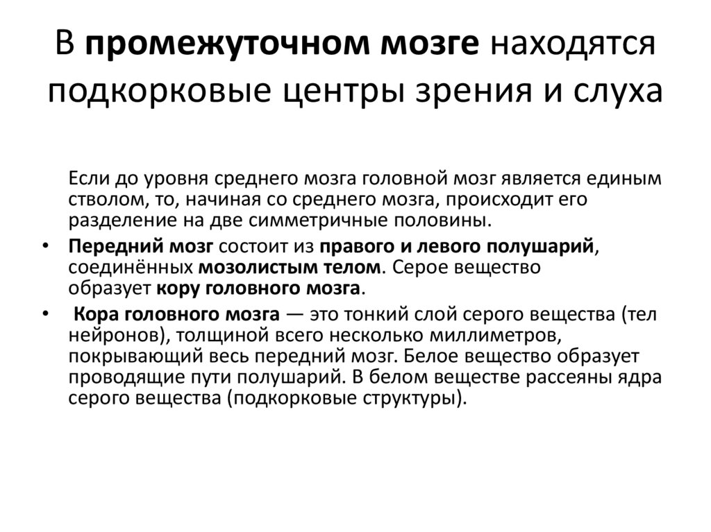 В промежуточном мозге находятсяподкорковые центры зрения и слуха