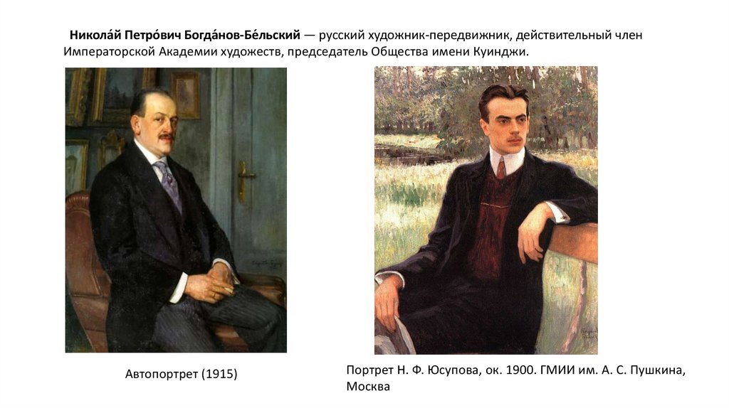 Никола́й Петро́вич Богда́нов-Бе́льский — русский художник-передвижник, действительный членИмператорской Академии художеств, председатель Общества имени Куинджи.