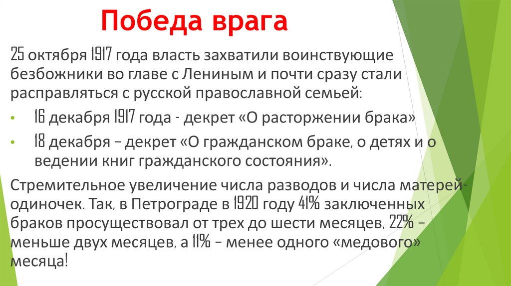 • 16 декабря 1917 года - декрет «О расторжении брака»
