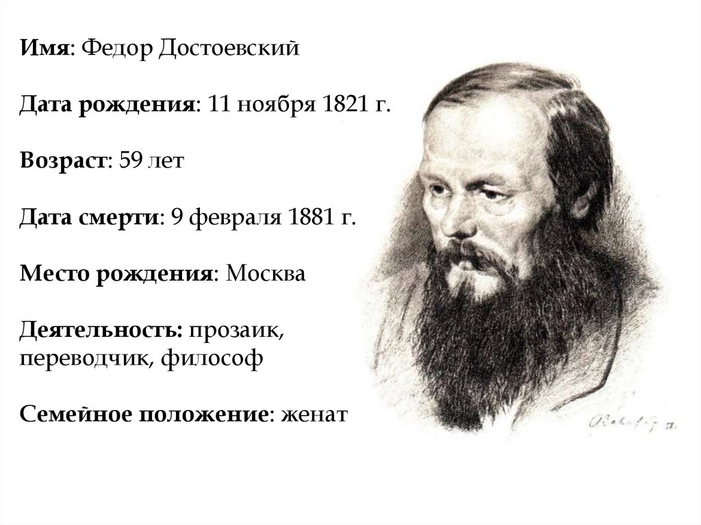 Имя: Федор ДостоевскийДата рождения: 11 ноября 1821 г.