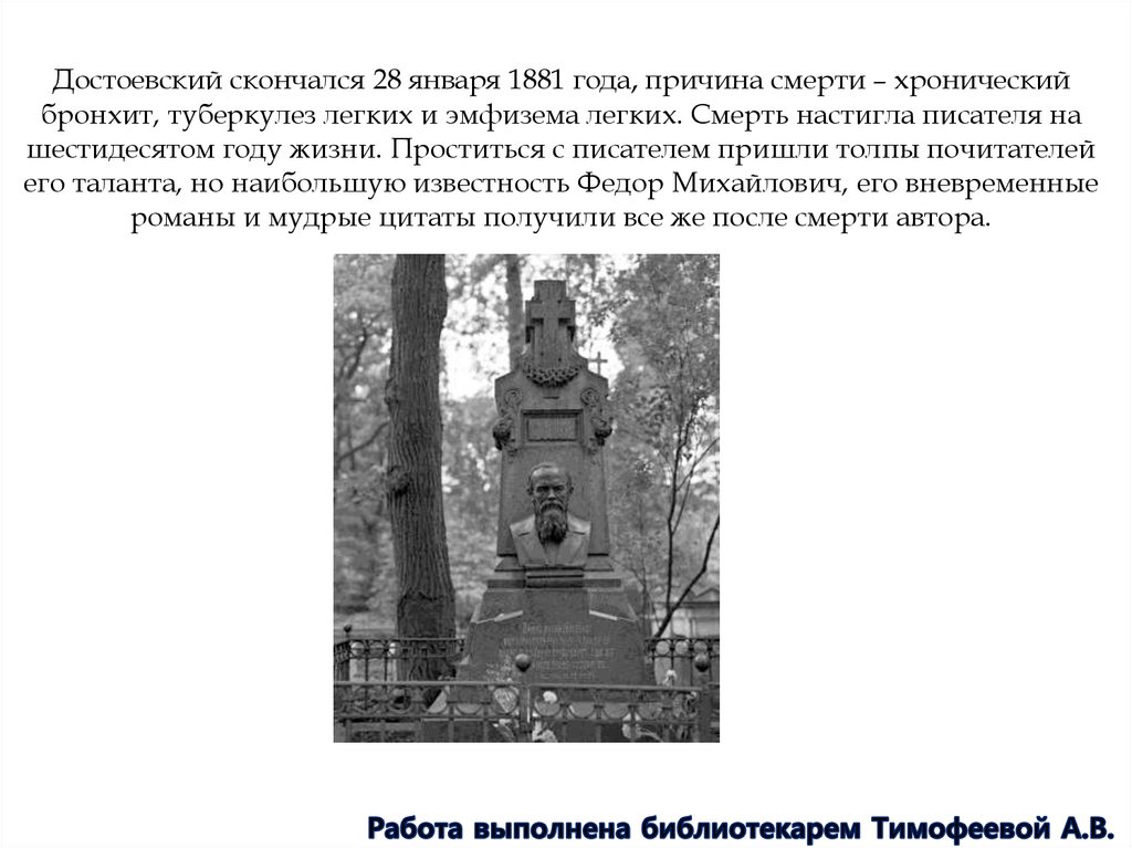 Достоевский скончался 28 января 1881 года, причина смерти – хроническийбронхит, туберкулез легких и эмфизема легких. Смерть настигла писателя на