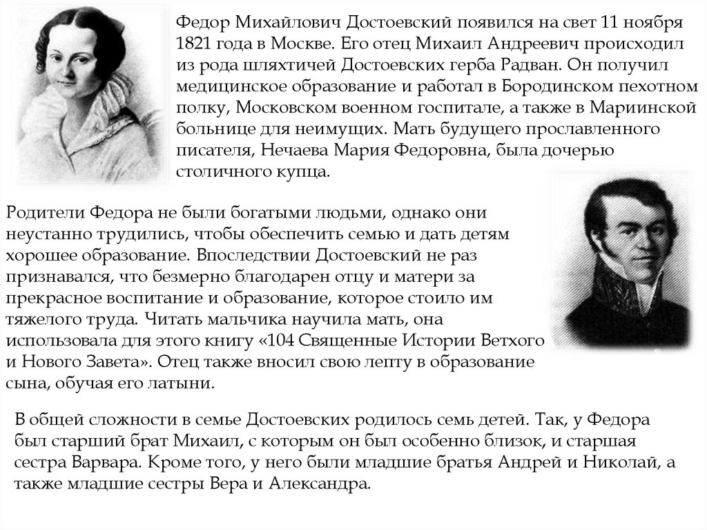 Федор Михайлович Достоевский появился на свет 11 ноября1821 года в Москве. Его отец Михаил Андреевич происходил