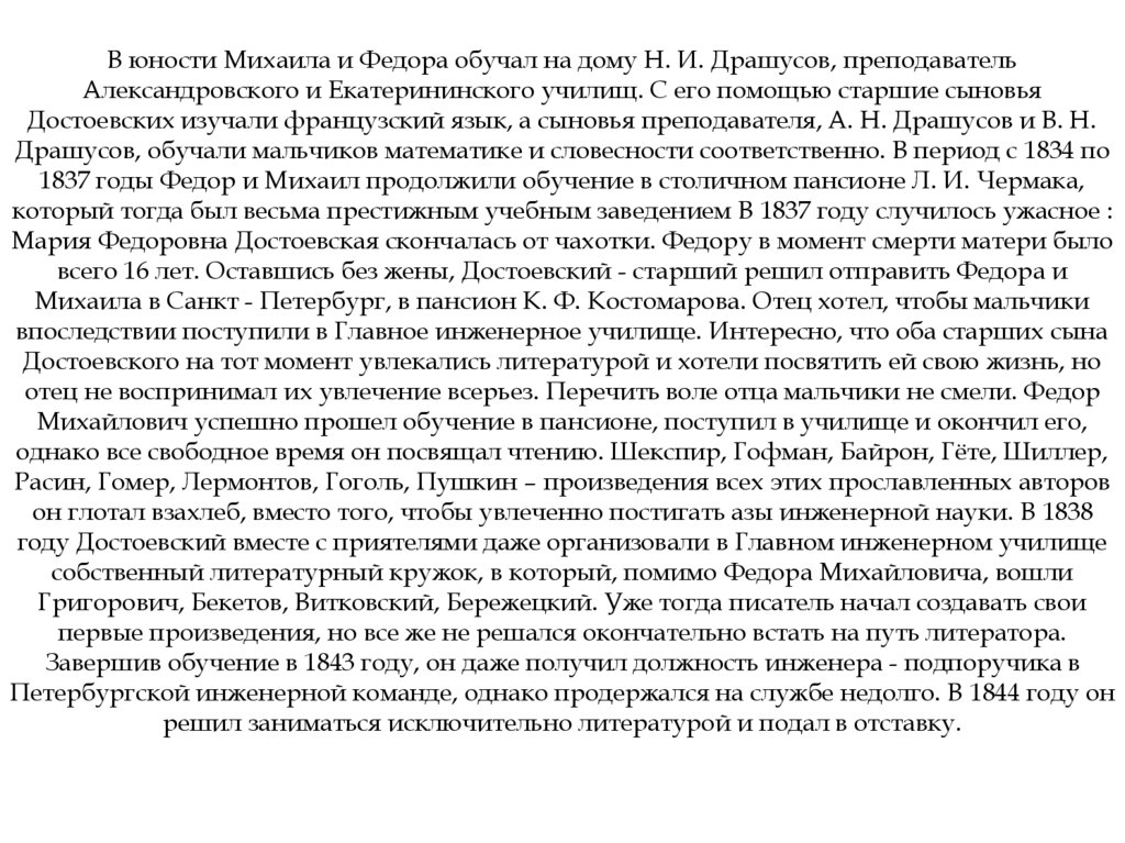 Достоевского на тот момент увлекались литературой и хотели посвятить ей свою жизнь, но