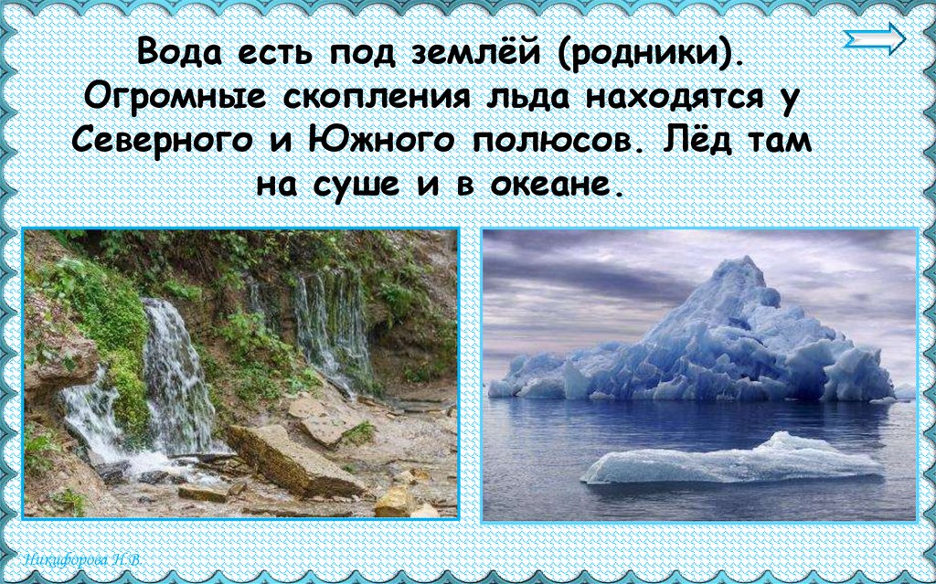 Вода есть под землёй (родники).Огромные скопления льда находятся у