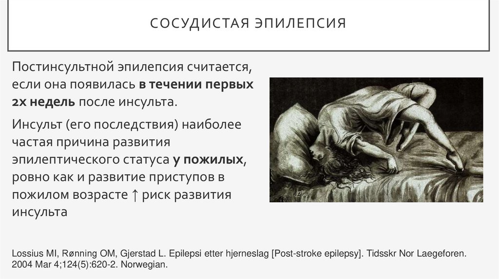 3. Lossius MI, Rønning OM, Gjerstad L. Epilepsi etter hjerneslag [Post-stroke epilepsy]. Tidsskr Nor Laegeforen. 2004 Mar
