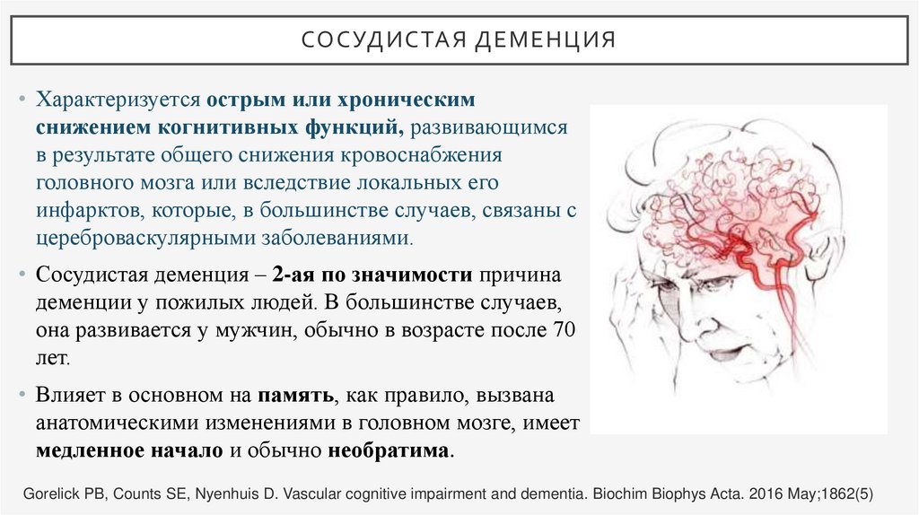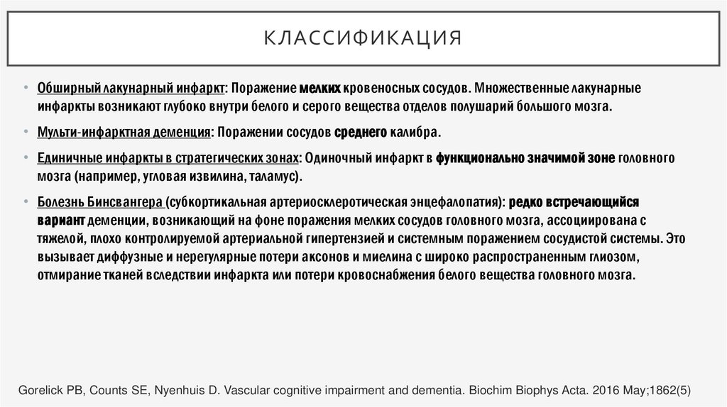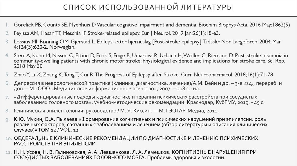 СПИСОК ИСПОЛЬЗОВАННОЙ ЛИТЕРАТУРЫ1. Gorelick PB, Counts SE, Nyenhuis D.Vascular cognitive impairment and dementia. Biochim Biophys Acta. 2016 May;1862(5)