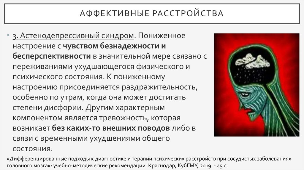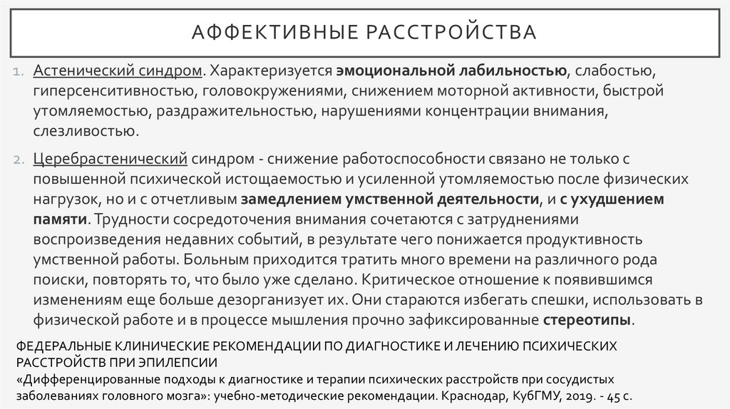 АФФЕКТИВНЫЕ РАССТРОЙСТВА1. Астенический синдром. Характеризуется эмоциональной лабильностью, слабостью,