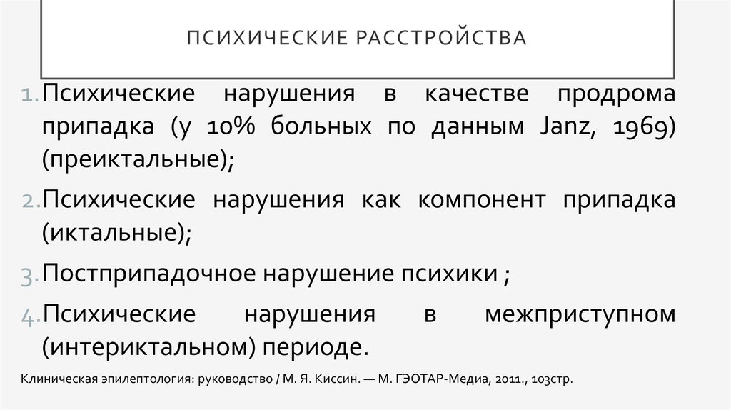 Клиническая эпилептология: руководство / М. Я. Киссин. — М. ГЭОТАР-Медиа, 2011., 103стр.