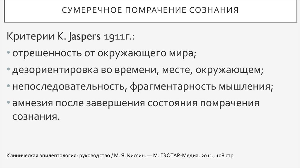 СУМЕРЕЧНОЕ ПОМРАЧЕНИЕ СОЗНАНИЯКритерии К. Jaspers 1911г.: