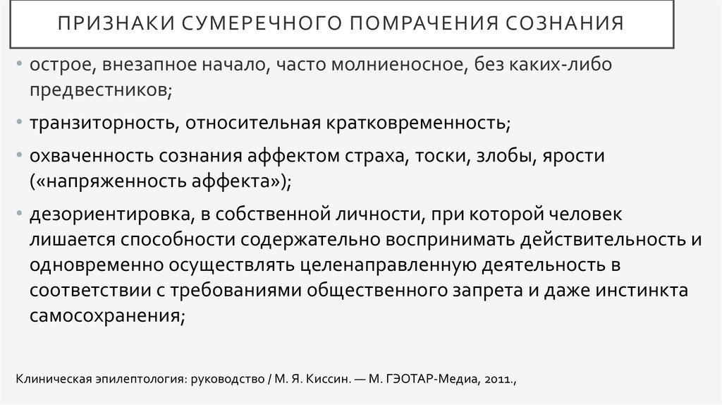 ПРИЗНАКИ СУМЕРЕЧНОГО ПОМРАЧЕНИЯ СОЗНАНИЯ• острое, внезапное начало, часто молниеносное, без каких-либо