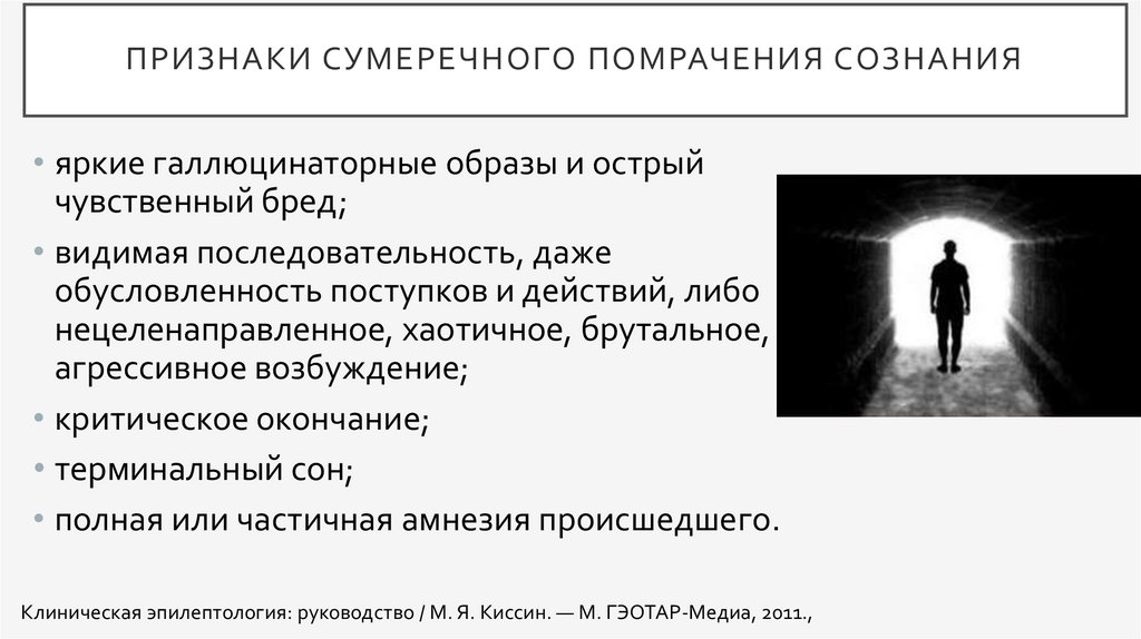 ПРИЗНАКИ СУМЕРЕЧНОГО ПОМРАЧЕНИЯ СОЗНАНИЯ• яркие галлюцинаторные образы и острый