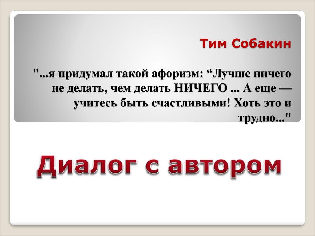 1. Тим Собакин "...я придумал такой афоризм: “Лучше ничего не делать, чем делать НИЧЕГО ... А еще — учитесь быть счастливыми! Хоть