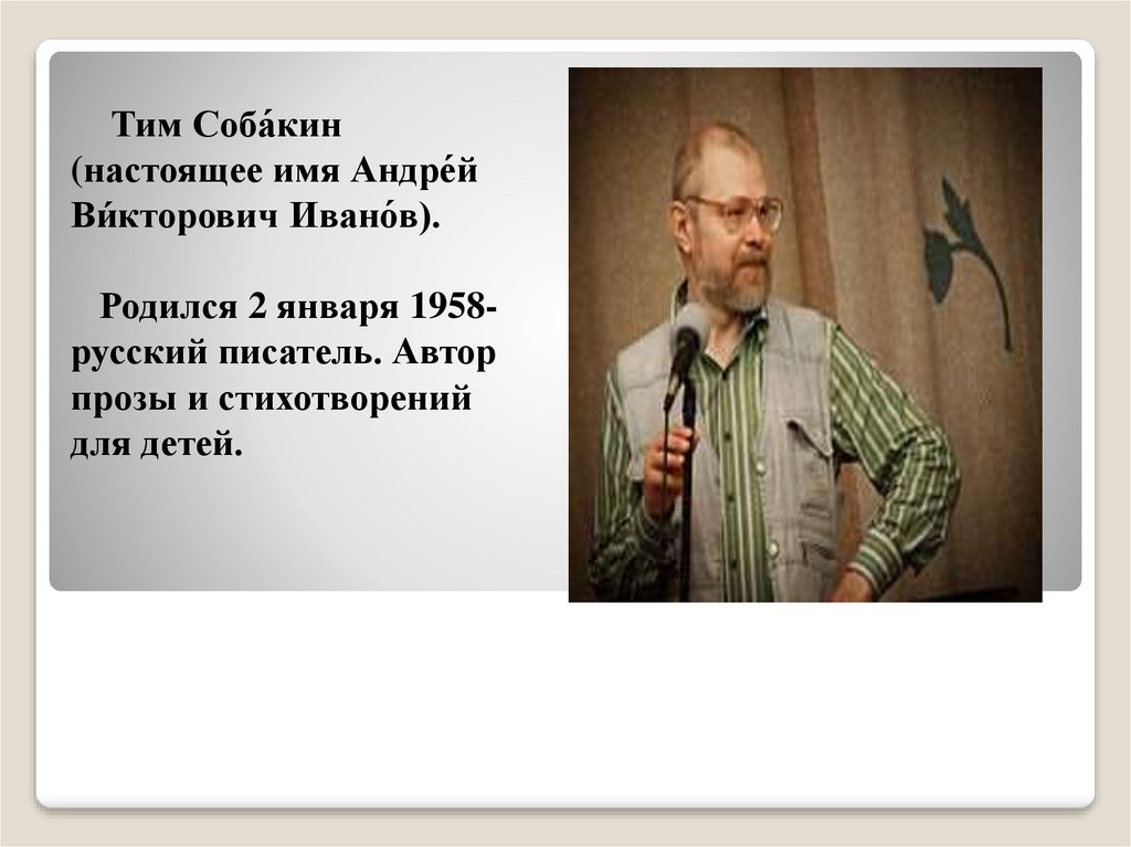 4. Как Собакин стал писателем Дети иногда спрашивают Тима Собакина: "Как вы стали детским писателем?" Тим задумчиво шевелит ушами,