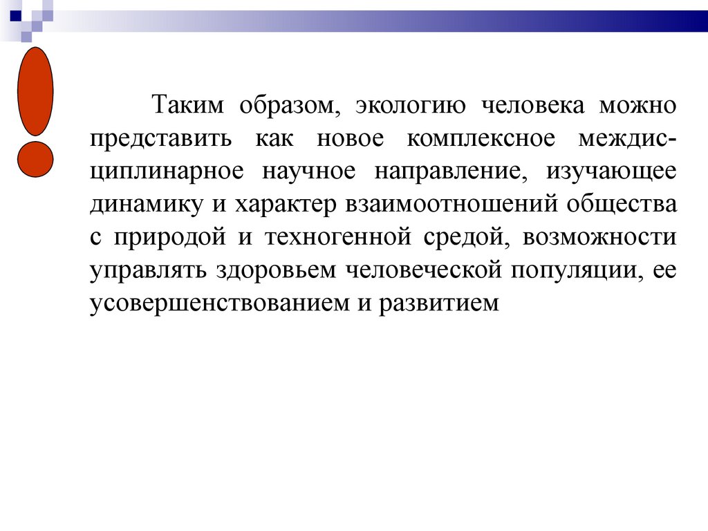 Таким образом, экологию человека можнопредставить как новое комплексное междисциплинарное научное направление, изучающее