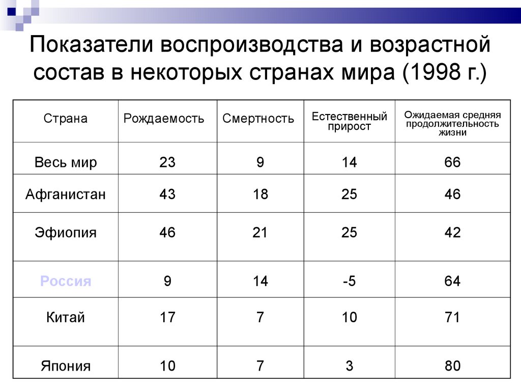 Показатели воспроизводства и возрастнойсостав в некоторых странах мира (1998 г.)