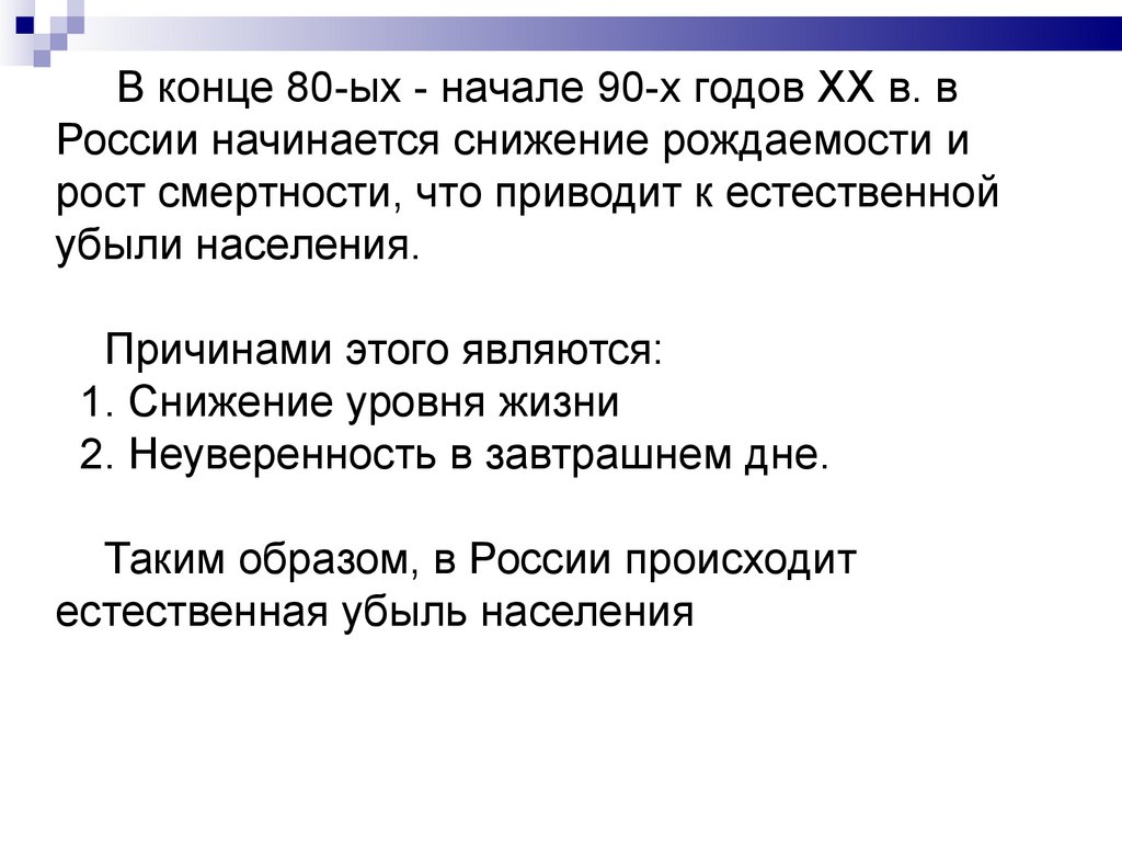 В конце 80-ых - начале 90-х годов XX в. вРоссии начинается снижение рождаемости и