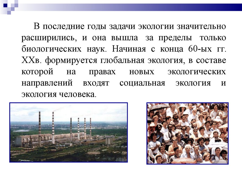 В последние годы задачи экологии значительнорасширились, и она вышла за пределы только