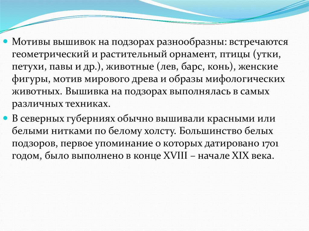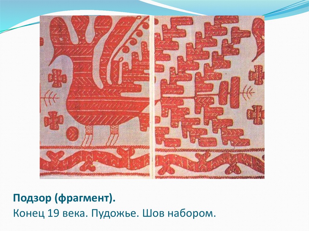 Мотивы вышивок на подзорах разнообразны: встречаютсягеометрический и растительный орнамент, птицы (утки,
