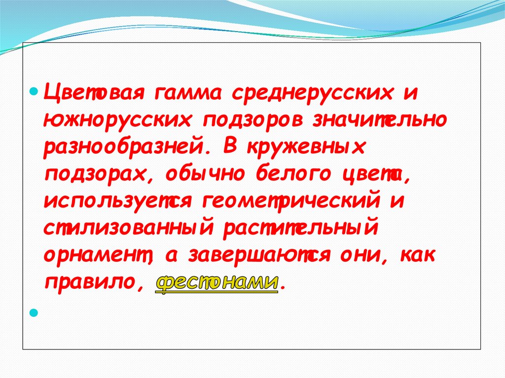 Цветовая гамма среднерусских июжнорусских подзоров значительно